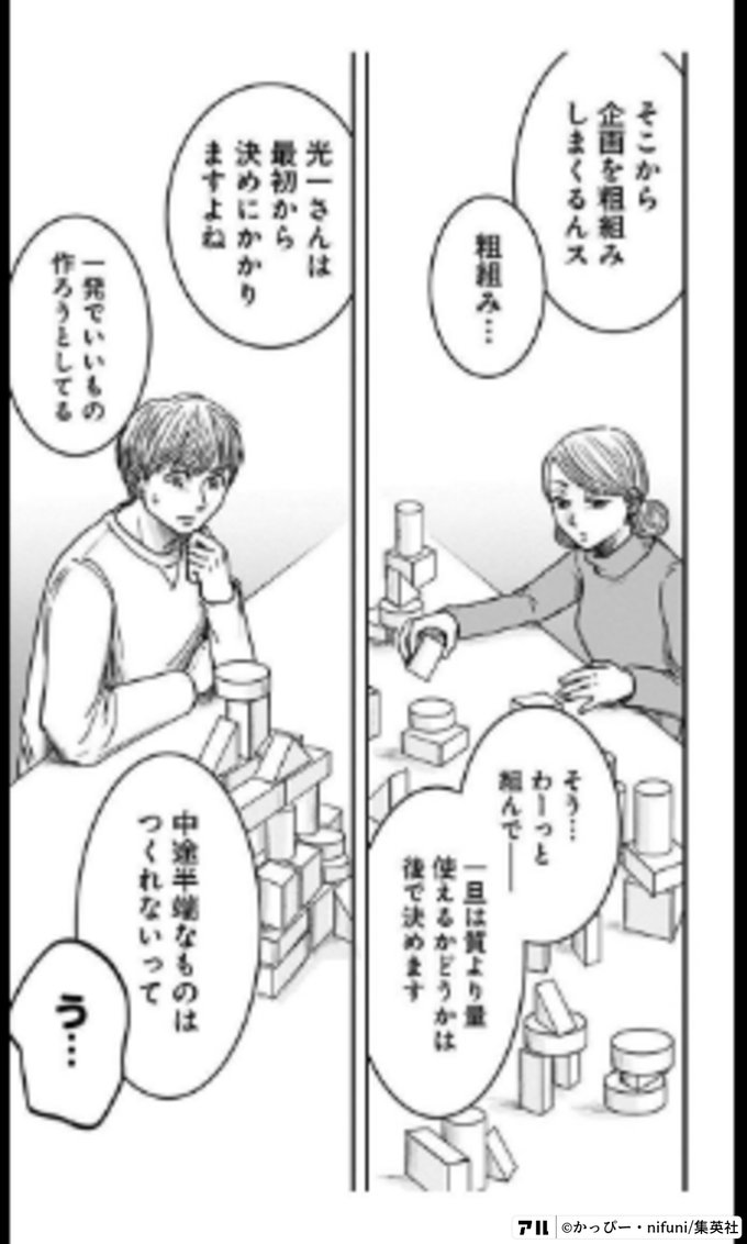 そこから企画を粗組しまくるんス 粗組み そう わーっと組んで 一旦は質より量 使えるかどうかは後で決めます 光一さんは最初から決めにかかりますよね 一発でいいもの作ろうとしてる 中途半端なものはつくれないって う 左ききのエレン アル