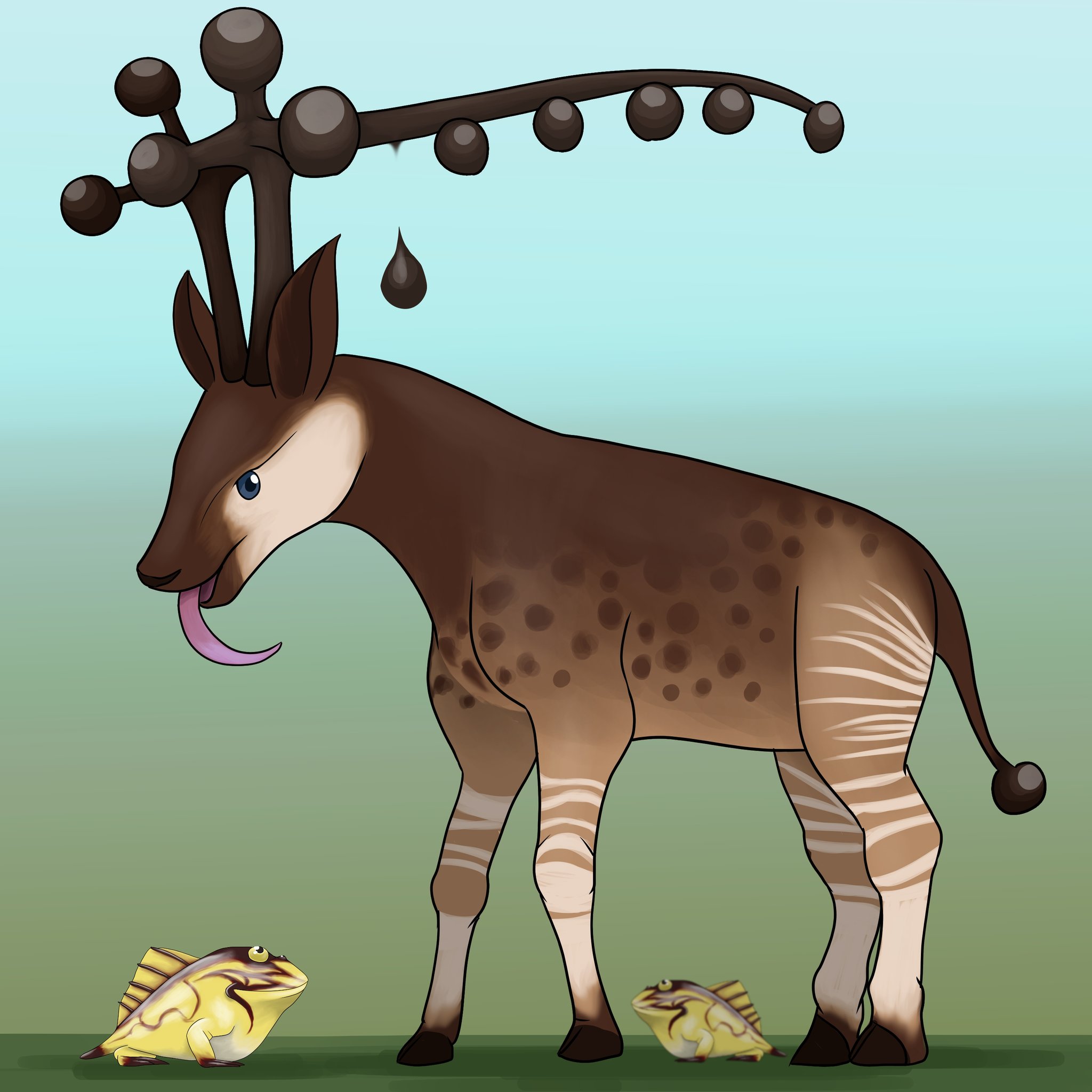 サウリプス𓅜𓆌𓆈 on twitter オリジナル環境生物考えてみました タピオカピ 角に黒くて丸いデンプン質の塊を実らせる草食動物 塊は 太肥御果 と呼ばれ 独特の食感と甘みの人気食材 アマトウガエル は 太肥御