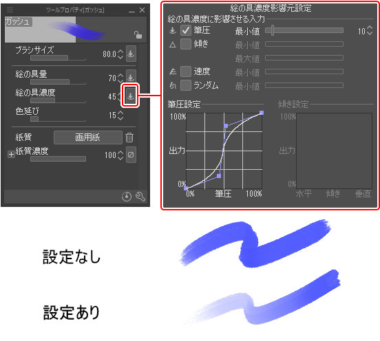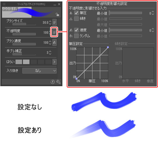 ブラシスタジオの設定 apple pencil 筆圧や傾きに応じて ブラシサイズや不透明度などが変化
