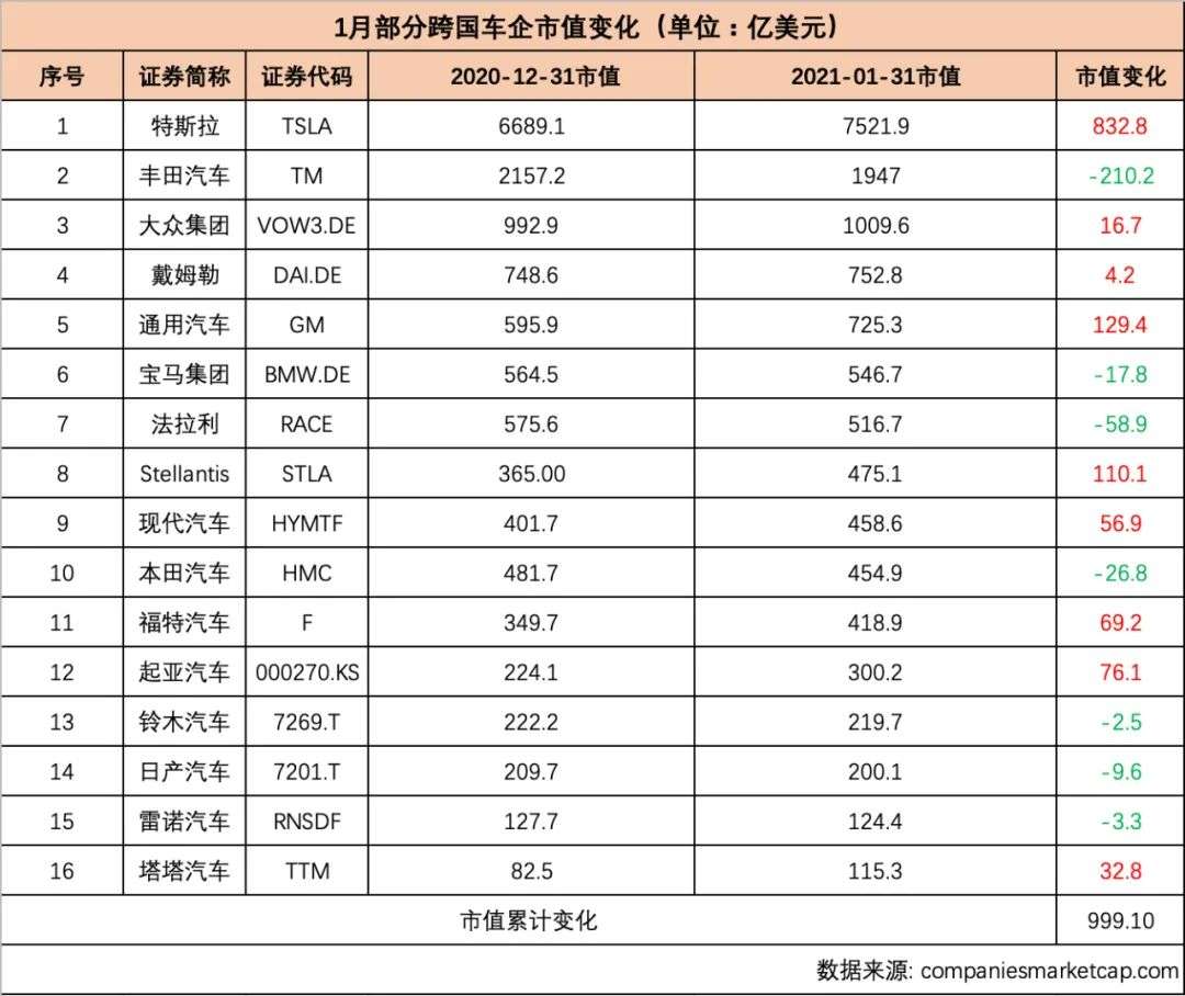 海外上市车企市值榜 特斯拉蔚来疯涨丰田领跑传统车企 东方财富网