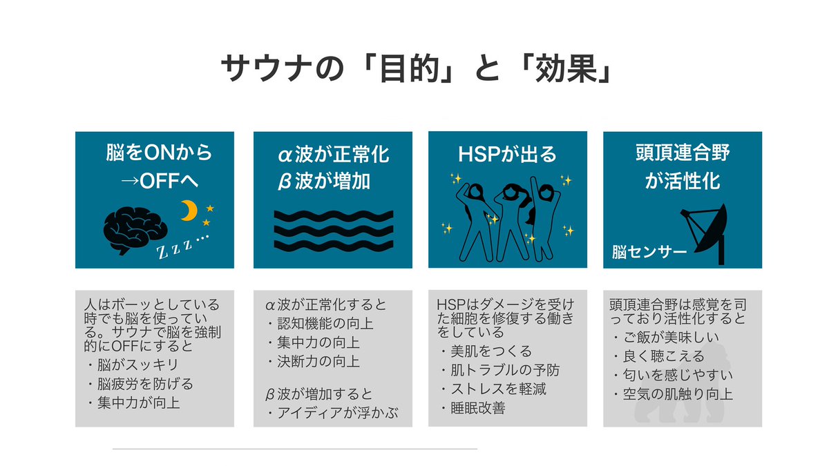 ひろ 図解療法士 on twitter 医者が教えるサウナの教科書を図解しました サウナが好きな人は仕事ができる サウナの効果 脳疲労がとれる 集中力が向上する 決断力が向上する 肌がきれいになる 痩せやすい体になる 睡眠の質が向上する