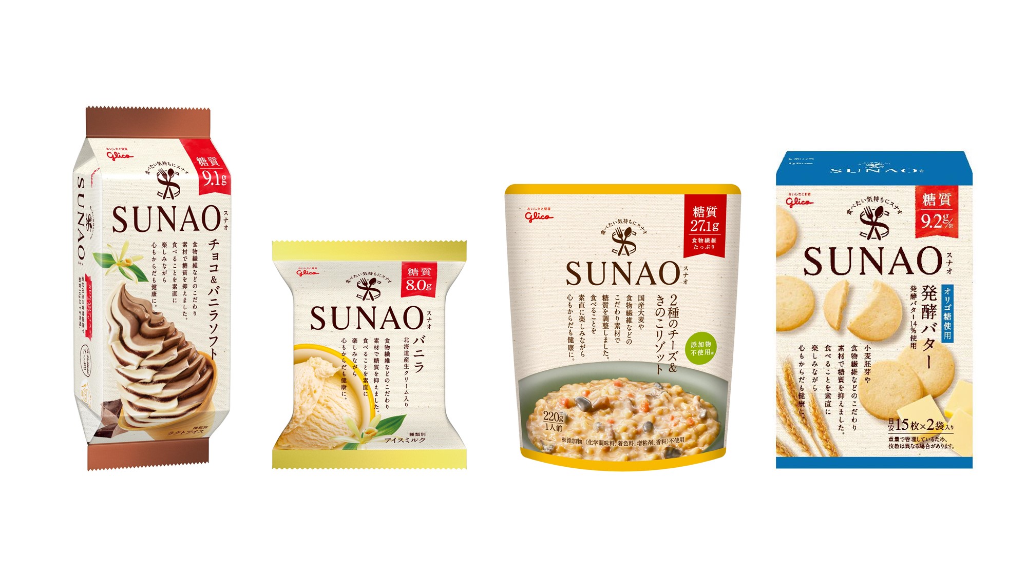 おいしさと適正糖質 1を両立する sunao ブランドがリニューアル ブランドの想いと糖質量を記載したパッケージで適正糖質の理解を促進 リゾットは3月2日 火 アイスは3月15日 月 ビスケットは3月16日 火 より発売 公式 江崎グリコ glico