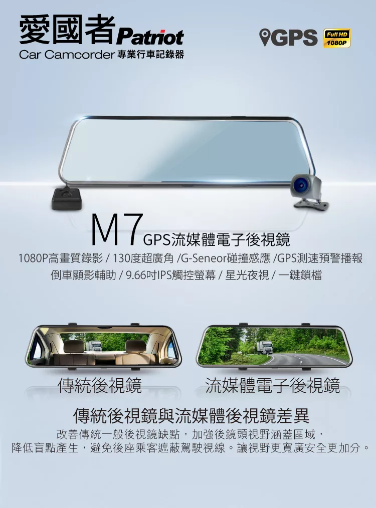 愛國者w7 大螢幕12吋2k高畫質流媒體雙鏡頭 觸控式電子後視鏡